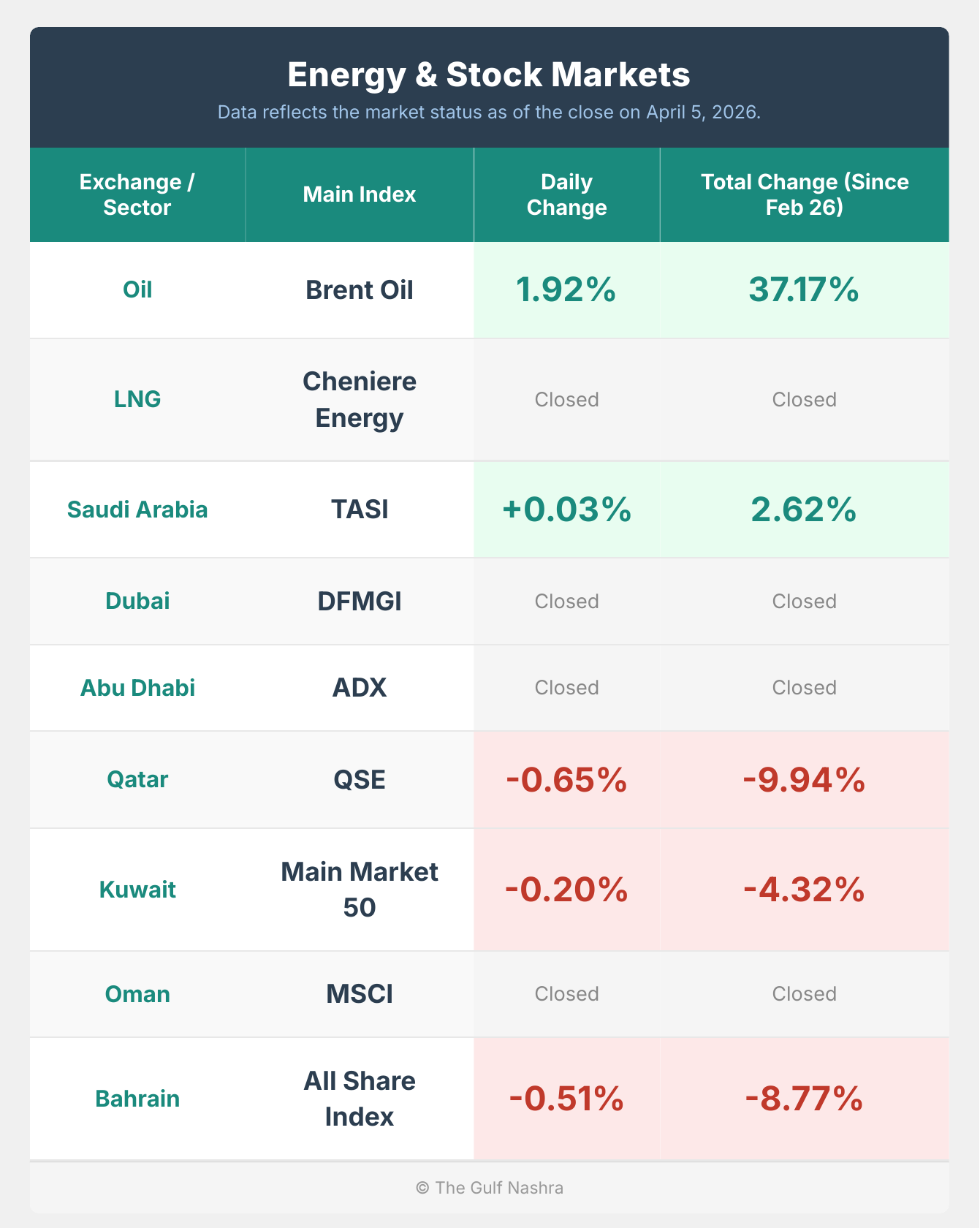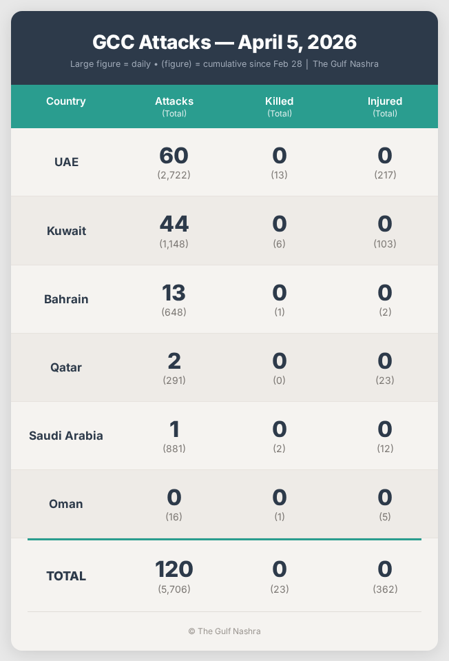 Iran War DailyIran War Daily — The Gulf ReportCovering April 5, 2026The Gulf NashraApr 06, 2026∙ PaidShareEnergy & Stock MarketsAttacks SummaryContinue reading this post for free, courtesy of The Gulf Nashra.Claim my free postOr purchase a paid subscription.